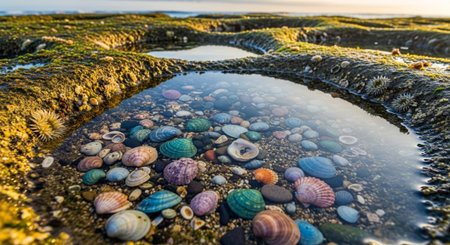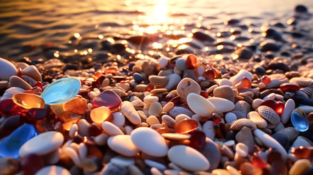 Vibrant stones and seashells lay partially buried in wet sand along the shoreline. Sunlight creates brilliant reflections showcasing a serene coastal environment at golden hour.