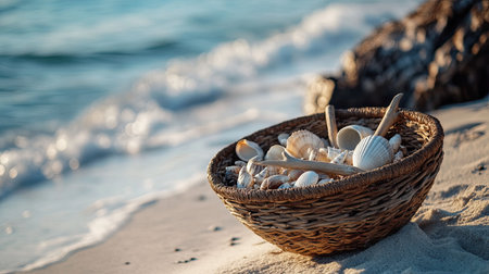 A woven basket filled with assorted shells rests gently on the sandy beach, accompanied by soft ocean waves that create a serene atmosphere.