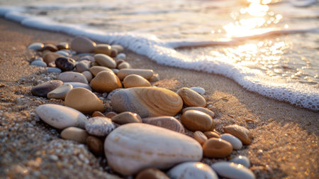 Smooth pebbles rest on the sandy beach while gentle waves softly wash over them, creating a serene atmosphere at sunset.