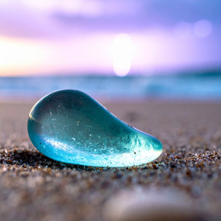 A single, perfectly tumbled piece of blue sea glass rests on the wet sand, glowing like a precious jewel in the soft light of a pastel sunset.