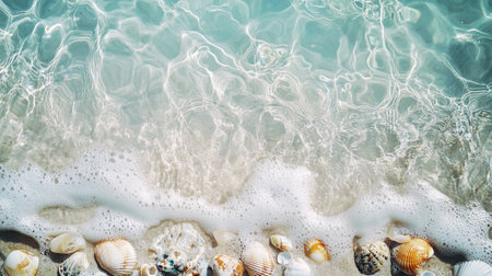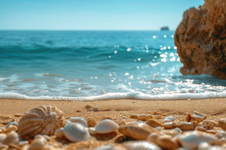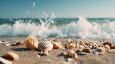 Shells and waves on a sandy beach during a sunny vacation day Generative AI