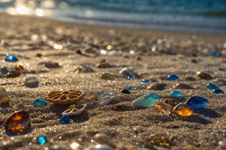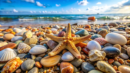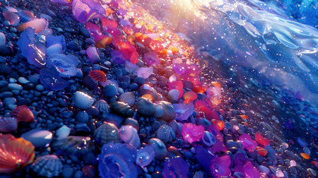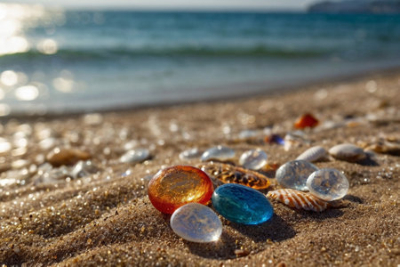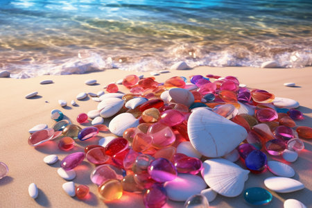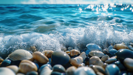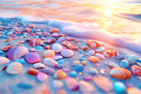 Shells and smooth stones create a vibrant mosaic on the sandy beach as waves lap gently