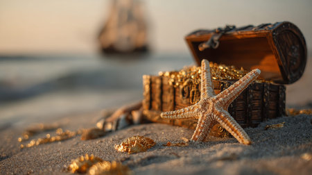 A treasure chest spills gold coins and jewelry on the sand by the ocean. An old ship sails in the distance as the sun sets. A starfish rests on the beach near the treasure.