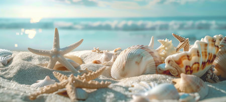 Beach summer panoramic background with seashells and starfish.