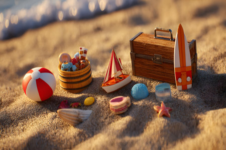 Colorful beach toys and a treasure chest arranged on sandy shore beside gentle waves on a sunny day