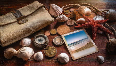 A vintage wooden box filled with seashells and nautical decor, evoking a coastal theme and a sense of nostalgia.