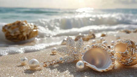 A beautiful arrangement of shells and pearls on a sandy beach, illuminated by soft light from the waves, creating a perfect ocean atmosphere.