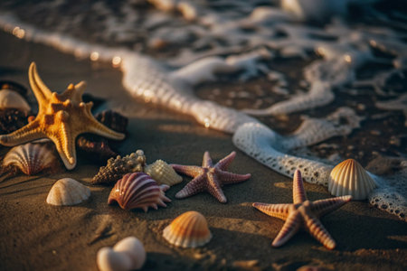 Seashells decorate the sandy shoreline while gentle waves wash ashore during sunset