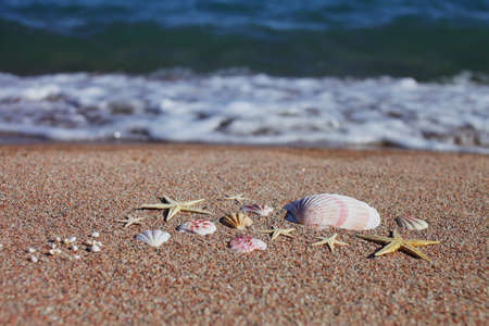Sea shells and starfish on the beach. Sandy beach with waves. Summer vacation concept. Holidays by the sea. High quality photo