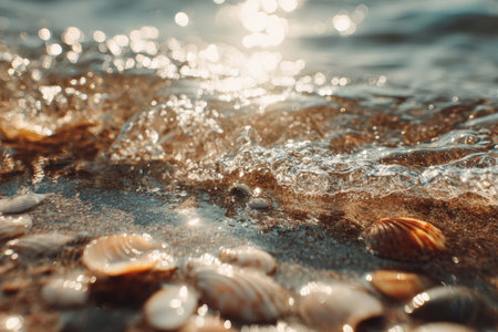 Low-angle macro shot of seashells scattered on golden sand with ocean waves and sunlight reflecting off the water, creating a serene beach scene.