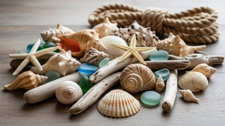 An assortment of seashells, starfish, and sea glass are arranged with a rope on a wooden surface. The composition features a variety of textures and warm tones. This image could be suitable for various commercial purposes, including decorative designs and website content related to marine life and coastal themes.
