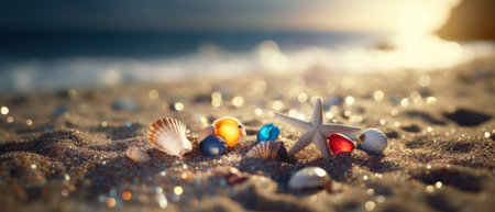A beautiful close-up view of seashells scattered on a sandy beach during sunrise, with sunlight reflecting off the shells, creating a serene and tranquil atmosphere.