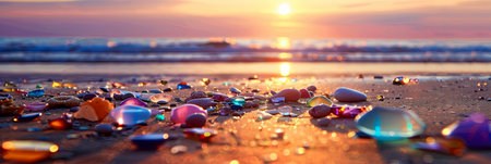 Sea glass and smooth pebbles are scattered along the sandy shore of a beach at sunset. The ocean waves are in the background and the sun is setting behind them.