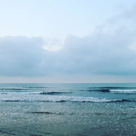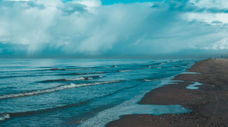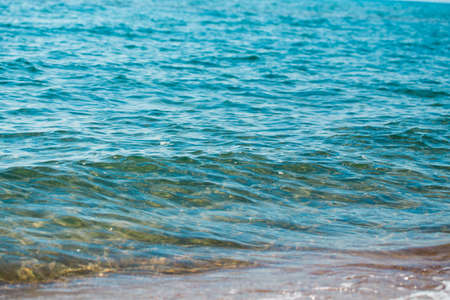 Beautiful water surface sea wave seascape soft focus background empty beach in cool blue and brown tones in Pontecagnano, Italy, Tyrrhenian sea.