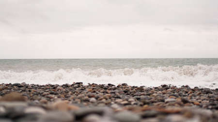 Wet sea stones in the sand at low tide. Waves and sea foam.