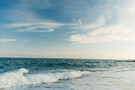 Baltic sea shore (sand dunes) at sunset. Soft sunlight, clear sky with glowing clouds, waves and water splashes. Idyllic seascape. Liepaja, Latvia, Europe. Warm winter weather, climate change, nature