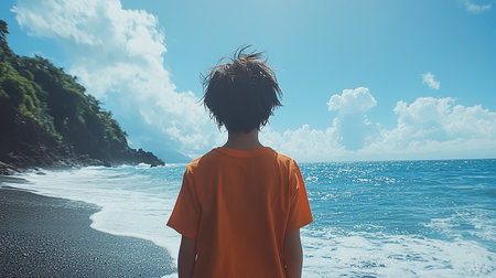 Generative AI Image of Back View of Boy Kid Standing on the Beach Nature Landscape in Summer