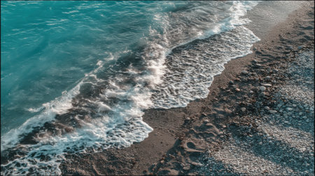 A stunning top down view captures the dynamic motion of turquoise sea waves with white foam as they crash against a dark, wet pebble beach creating a beautiful natural abstract.