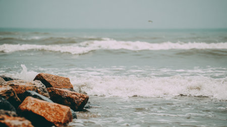 A serene coastal scene featuring gentle ocean waves with white foam washing over large brown rocks on a calm, overcast day. A tranquil and natural seascape background.