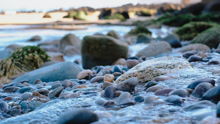Close-up view of colorful wet pebbles and smooth stones on a beach shoreline with shallow water gently flowing between them
