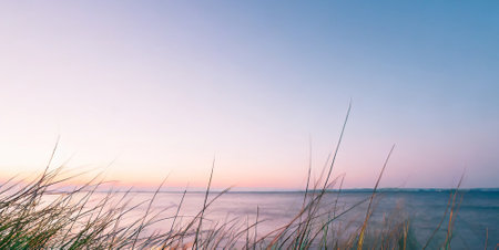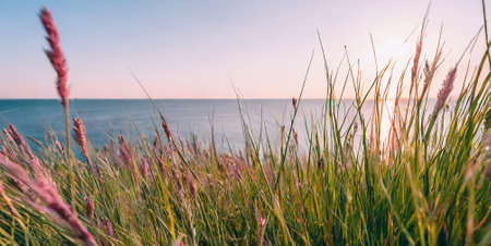 Experience the beauty of a vivid sunset over the ocean, highlighting golden grass swaying gently in the breeze. A perfect moment of nature's tranquility.