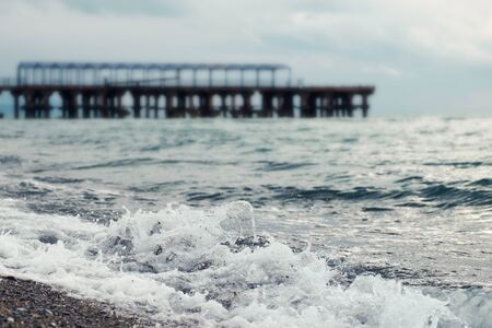 White sea wave splash on rocky beach with a pier on a blurred background, selective focus