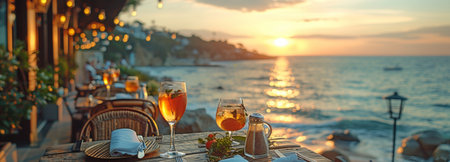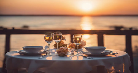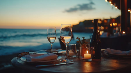 A romantic dining scene by the sea featuring glasses of wine, gourmet food, and a breathtaking sunset. The tranquil atmosphere creates an unforgettable experience.