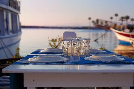 Seaside blue table and chairs open cafe outdoor restaurant in Greece on sea shore. Summer vacation on resort.