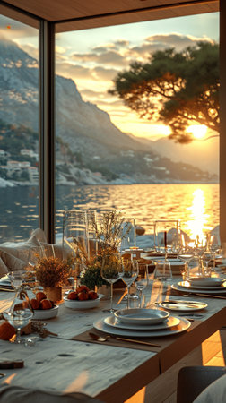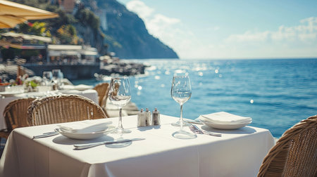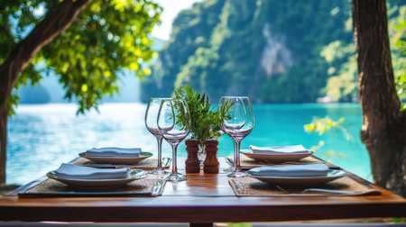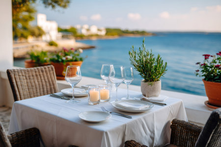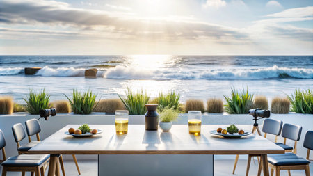 A picturesque seaside dining setting showcasing an elegant table by the ocean, perfect for a romantic meal, with stunning views and serene atmosphere ideal for relaxation.