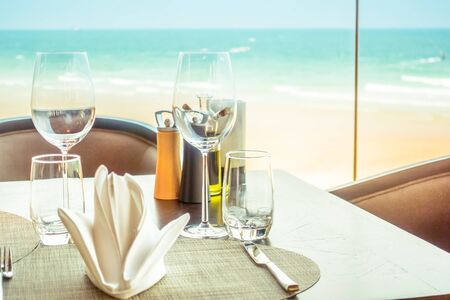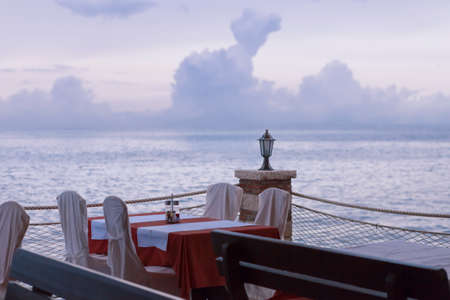 Vacation breakfast or dinner table at restaurant with sea view in tropics