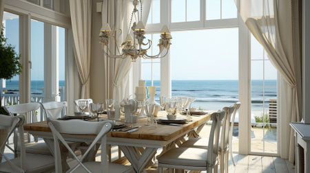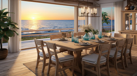 Beach dining room sand tones, shells, water touches., generative AI