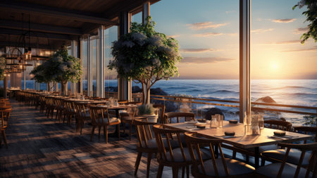 A warm and inviting beachfront restaurant showcases stunning ocean views, with wooden tables and sunlight streaming through large windows. Perfect for relaxation.