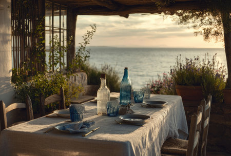 An outdoor table is set with tableware and bottles, illuminated by warm sunlight. The composition features a white tablecloth and wooden chairs, suggesting a setting for meals. The background reveals the sea and sky, enhancing the scene's tranquil ambiance, suitable for illustrating dining experiences or lifestyle themes.