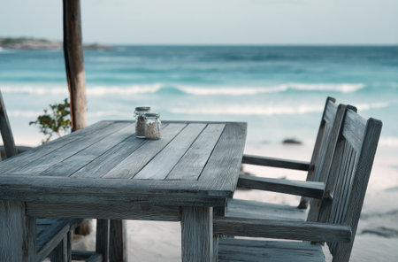 A wooden table and chairs sit on a sandy beach, with the ocean in the background. The scene features a natural palette of blue and brown tones. The composition includes an overhead perspective, creating a serene ambiance suitable for various commercial uses.