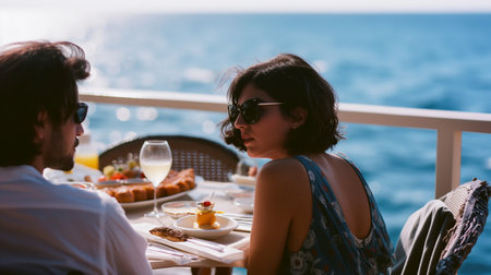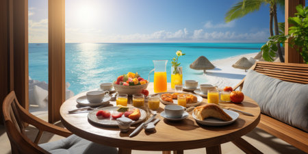 vacation breakfast in luxury hotel with ocean view. Summer love, romance date on vacation concept. AI Generated