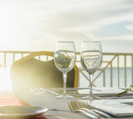 Prepared table with candles and wine glasses for a romantic seaside meal