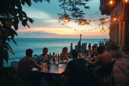 Sunset dining experience with friends beachside restaurant outdoor gathering tropical evening relaxed atmosphere