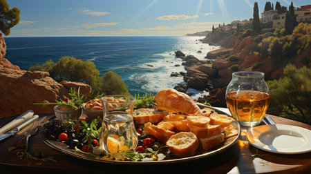A rustic outdoor picnic set against a Mediterranean sea backdrop, featuring fresh produce, bread, and wine