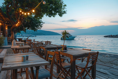 Tranquil Seaside Dining at Sunset with Empty Wooden Tables, String Lights, and Docked Boat