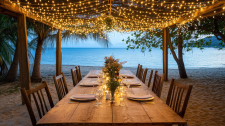An enchanting beach dining setup features a long wooden table adorned with fairy lights, floral centerpieces, and ocean views, perfect for gatherings.