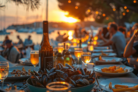 Seafood dinner with wine on a table by the sea at sunset, creating a romantic atmosphere