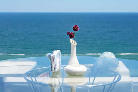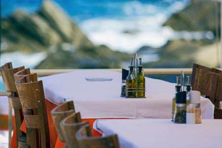 Table and chairs on the terrace of a restaurant overlooking the sea