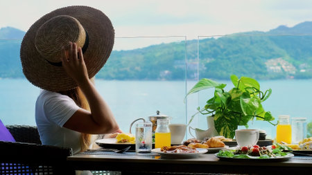 Woman in hat in cafe by the sea enjoy breakfast buffet or dinner