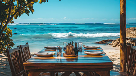 Enjoy a serene dining experience at a beautifully set wooden table overlooking the tranquil ocean waves and sandy beach, perfect for relaxation.