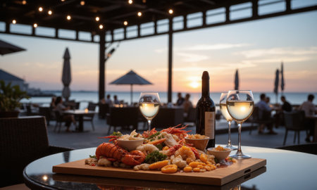 Beachfront Restaurant with Seafood Platter, Wine, and Sunset A beachside restaurant featuring a seafood platter with lobster, shrimp, and oysters, paired with glasses