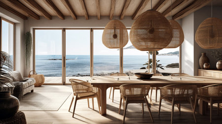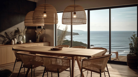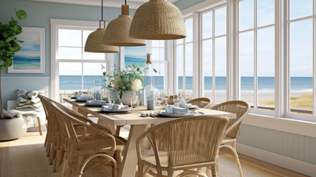 Interior design inspiration of Coastal Nautical style home dining room loveliness decorated with Rattan and Seagrass material and Window .Generative AI home interior design .