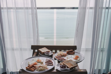 Hotel American breakfast set served in the room in the morning.
