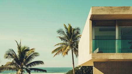 A luxurious villa overlooking a clear blue ocean, with a serene beachfront setting and sunny skies.