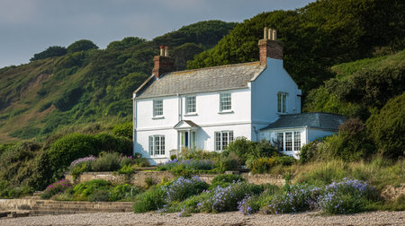Historic white cottage situated on a shingle beach with an elevated garden, offering idyllic coastal lifestyle and tranquil views