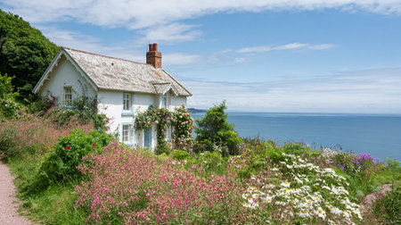 A charming cottage overlooks the restless ocean waves, framed by colorful flowers in the foreground, creating a serene seaside atmosphere on a cloudy afternoon.